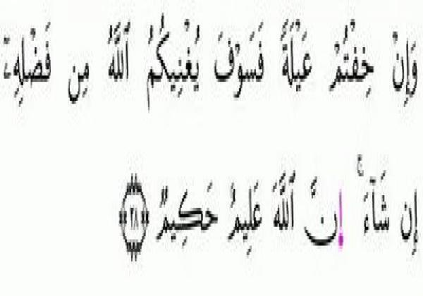 إن خفتم أيها المؤمنون فقرا بسبب التزام أحكام الله، فسيغنيكم الله تعالى من فضله، وكثيرة هي الأشياء التي نمارسها خطأ بحجة تشجيع الاقتصاد والاستثمار، فإن تركنا الحرام الذي نص الشرع عليه لله، فسيعوضنا الله خيرا منه، وينبغي أن يكون هذا يقينا راسخا، فالضامن هو الله، وكفى بالله وكيلا.
